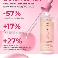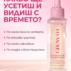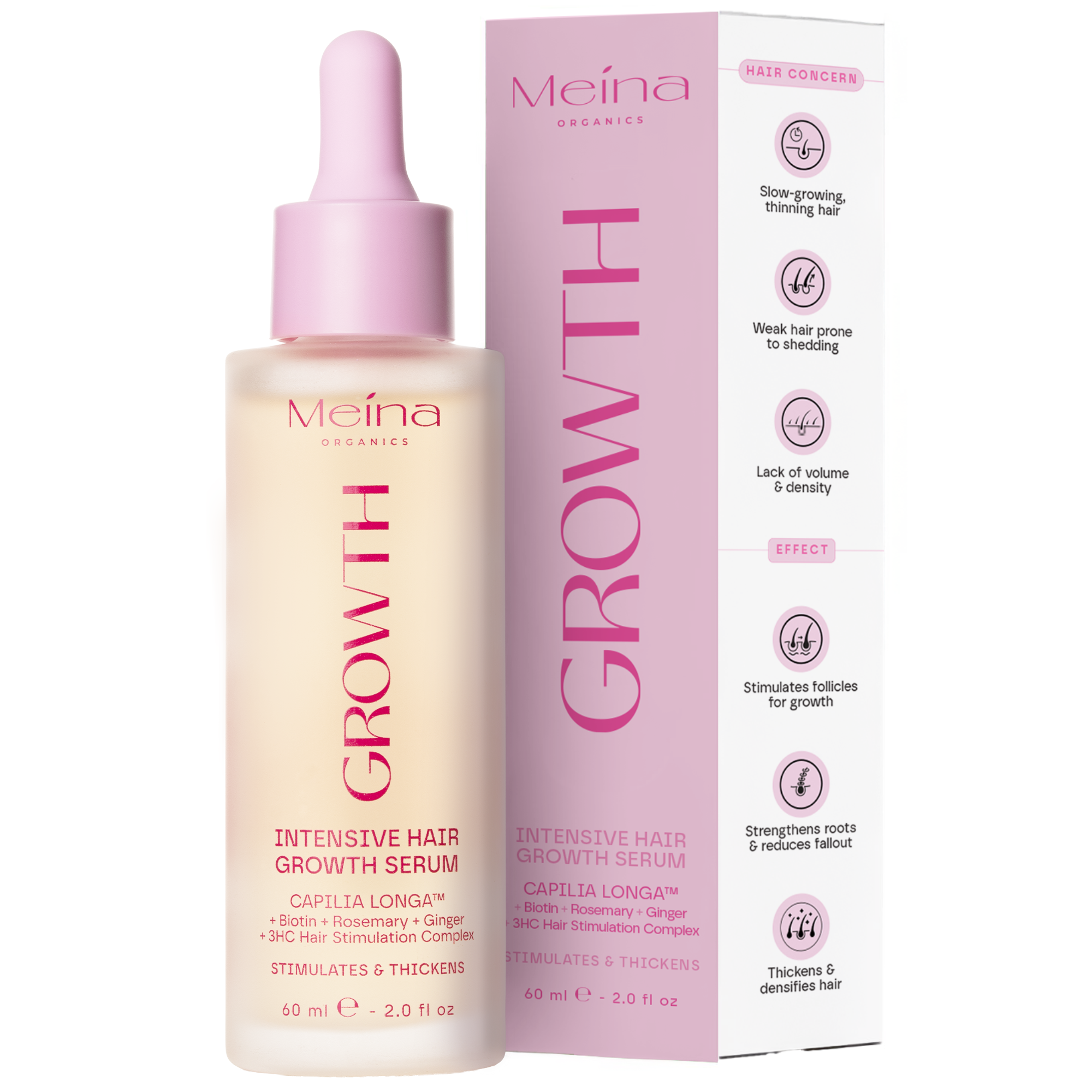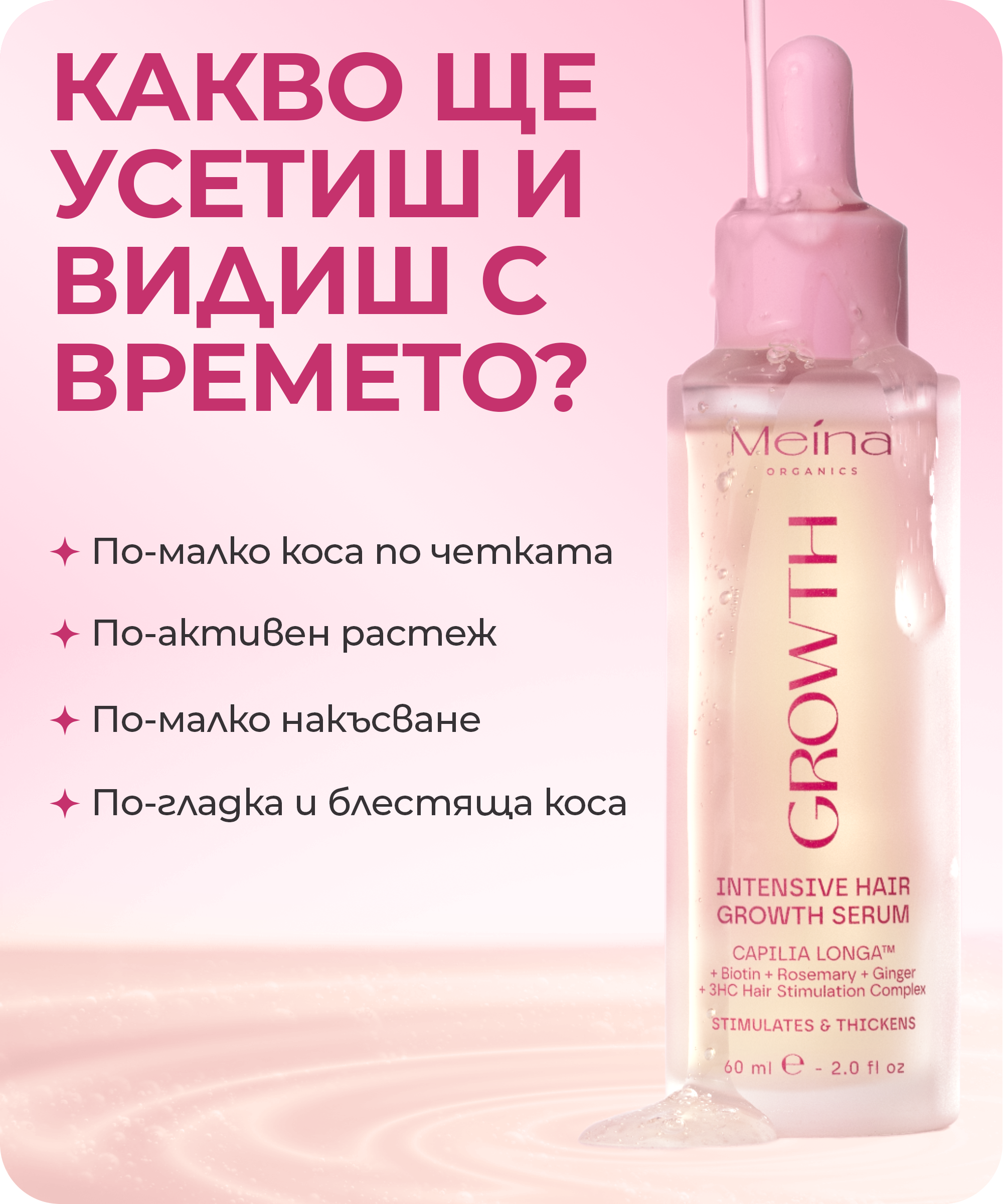С редовна употреба на серумът за растеж на Meina Organics от серията Growth, косата изглежда по-здрава, по-гладка, по-блестяща и в пъти по-лесно постигаш мечтаната дължина, благодарение на специално подбраната комбинация от мощни активни съставки, които буквално “събуждат” косата ти.