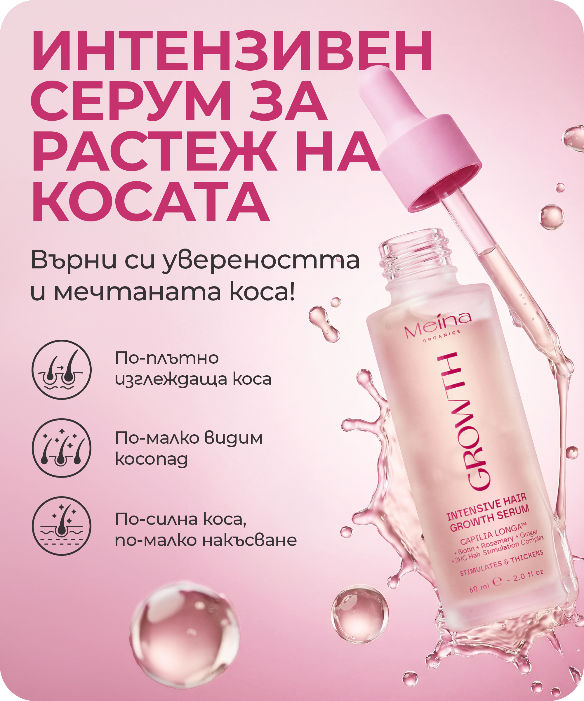 Ако косата ти изтънява, капе повече от обичайното под душа или при сресване, или просто не може да порасне над определена дължина, то серумът за интензивен растеж на косата на Meina Organics е създаден точно за това: да помогне там, откъдето всичко започва – скалпа и корена.
