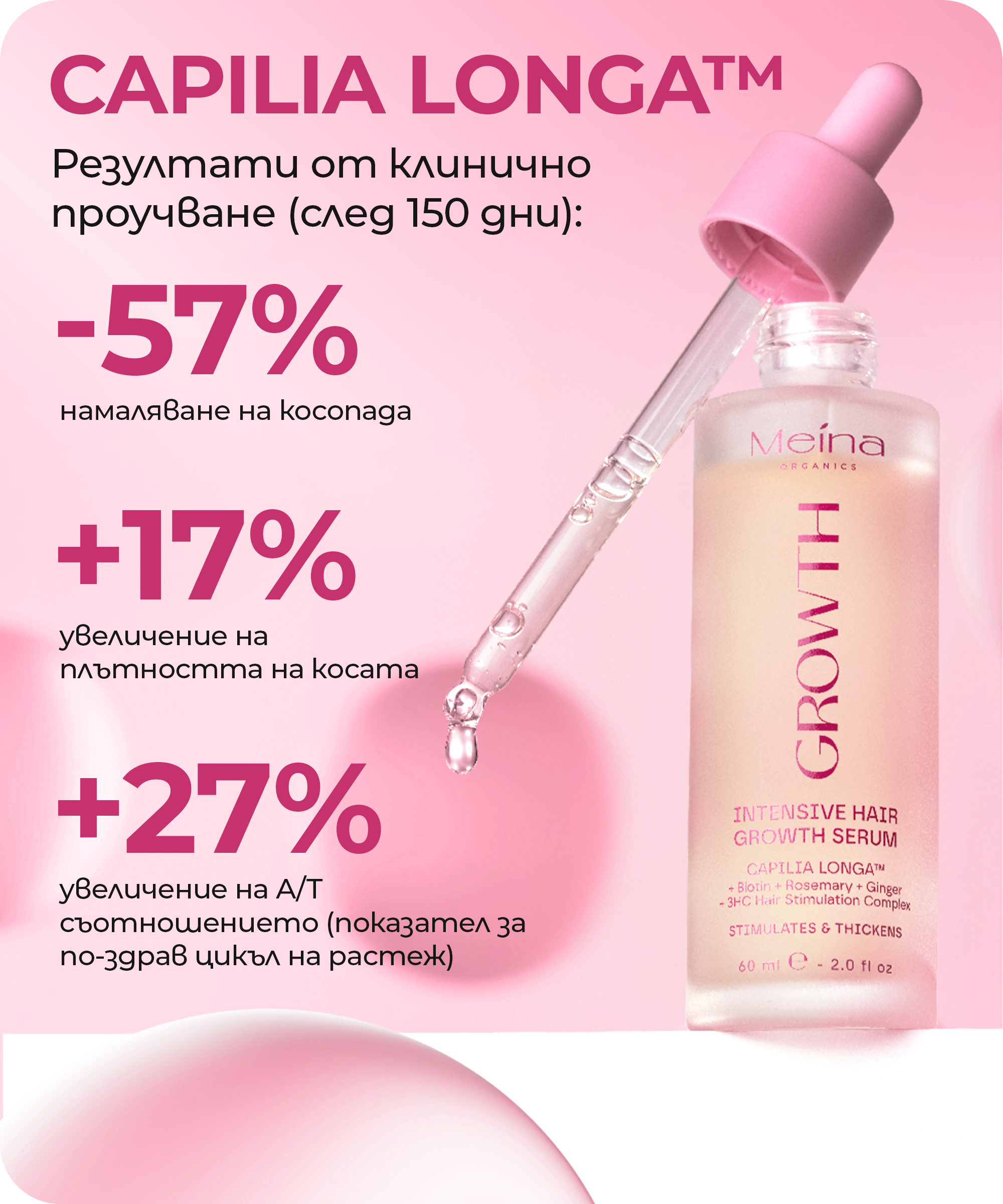 Какво отличава серумът за растеж на косата на Meina Organics от повечето серуми за коса: Повечето серуми осигуряват само повече блясък, по-малко фриз, или по-гладка коса. Серумът за растеж на Meina Organics е различен, защото е създаден да работи в дълбочина: от дермалната папила на фоликула и корена, чрез модерна пептидна технология от растителни стволови клетки, която подпомага по-здрав и активен цикъл на растеж. Действието е изключително силно, благодарение на 2 клинично тествани активни комплекса: