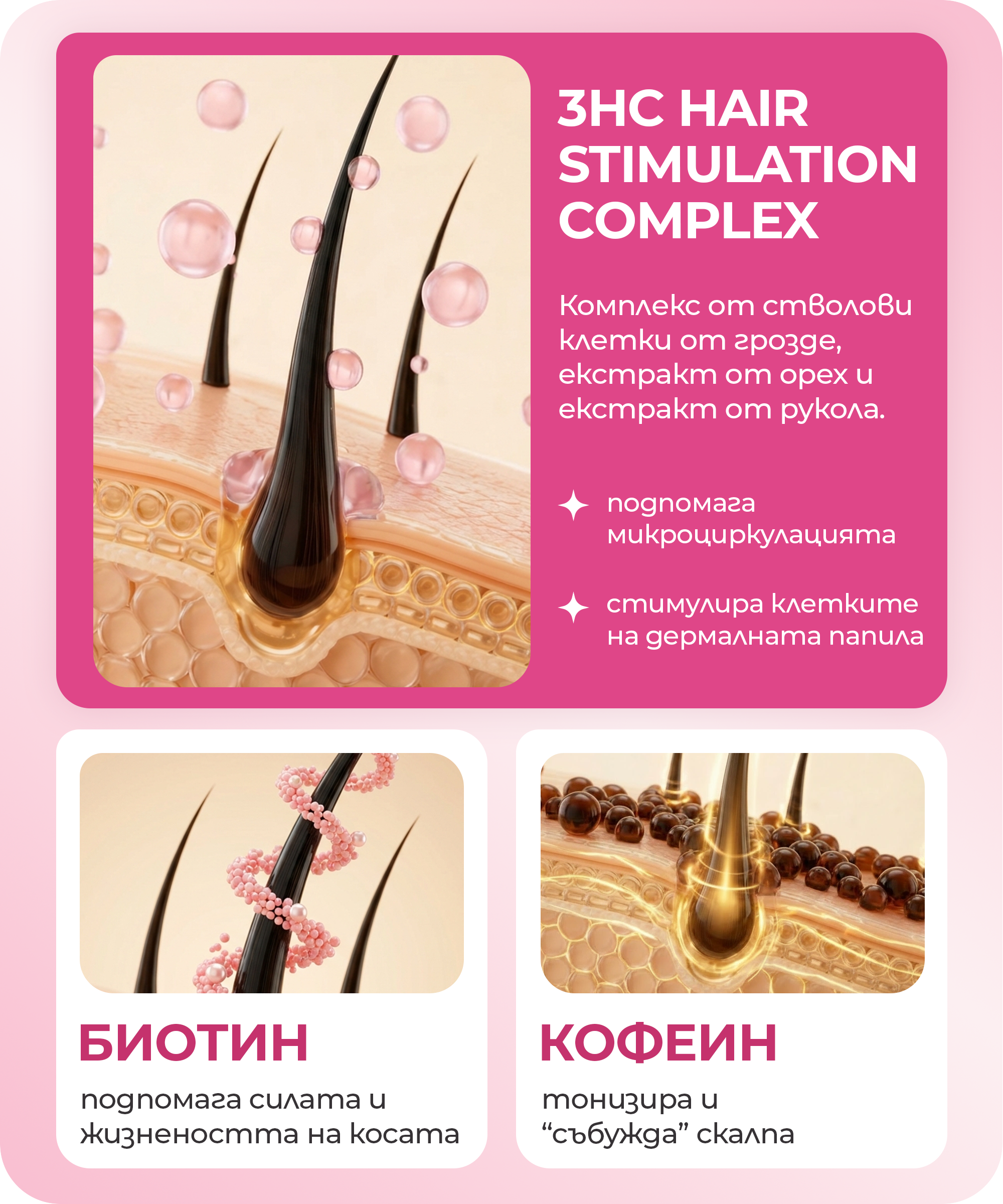 3HC е растителен комплекс със стволови клетки от зелено грозде, екстракт от орех и екстракт от рукола. Разработен е да подпомага микроциркулацията и да стимулира клетките на дермалната папила: ключовите клетки, които участват в стартирането на растежа и в по-здравото „закрепване“ на косъма с корена.